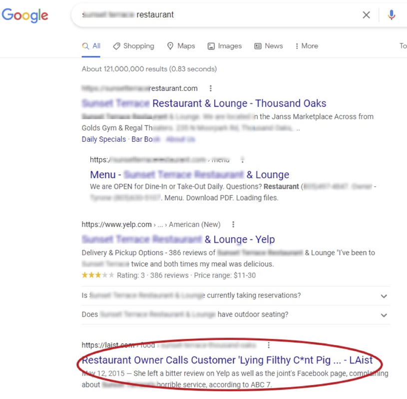 Sometimes negative reviews of your business—or even your response to those reviews—can end up getting coverage in the news media. That's bad news, because the resulting story may well rank on the first page of your search results for a very long time—often years after the fact. This is partly because, unlike Europe, the United States doesn’t have the "right to be forgotten," which compels search engines to remove outdated or irrelevant content in certain instances.